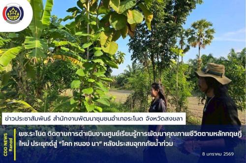 ภายใต้การอำนวยการของนางสาวณัฐกานต์ สายน้อย นายอำเภอระโนด โดย นางพันทณี แป้นทอง พัฒนาการอำเภอระโนด มอบหมายให้ นางสาวกุลนันทน์ โสรัสสะ นักวิชาการพัฒนาชุมชนปฏิบัติการและนายณัฐสิทธิ์ วิจิตรเวชการ นักวิชาการพัฒนาชุมชนปฏิบัติการ ลงพื้นที่ติดตามการดำเนินการศูนย์เรียนรู้การพัฒนาคุณภาพชีวิตตามหลักทฤษฎีใหม่ ประยุกต์สู่ “โคก หนอง นา” หลังประสบอุทกภัยน้ำท่วม โดยแปลงดังกล่าว เป็นพื้นที่แปลงขนาด 3 ไร่ อยู่ในพื้นที่ลุ่มทะเลสาบสงขลา น้ำท่วมพืชผักเสียหาย มีเพียงต้นไม้ใหญ่ที่รอดจากน้ำท่วม