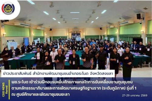 อำเภอระโนด ภายใต้การอำนวยการของนายเอกสิทธิ์ สองเมือง นายอำเภอระโนด โดยนางพันทณี แป้นทอง พัฒนาการอำเภอระโนด มอบหมายให้นางสาวจุไรรัตน์ กิตติญาณหงส์ นักวิชาการพัฒนาชุมชนชำนาญการ นำคณะกรรมการกลุ่มออมทรัพย์เพื่อการผลิต 1 คน และคณะกรรมการโครงการ กข.คจ. 1 คน เข้าร่วมฝึกอบรมตามโครงการเสริมสร้างศักยภาพกลไกการขับเคลื่อนงานทุนชุมชน กิจกรรมที่ 2 เพิ่มศักยภาพกลไกการขับเคลื่อนงานทุนชุมชนตามหลักธรรมาภิบาลและการพัฒนาเศรษฐกิจฐานราก (ระดับภูมิภาค) รุ่นที่ 1 ระหว่างวันที่ 27 - 29 มกราคม 2569 ณ หอประชุมปาล์ม ศูนย์ศึกษาและพัฒนาชุมชนยะลา อำเภอเมืองยะลา จังหวัดยะลา
